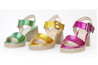 Alongside power shades, colours such as black, blue and beige remain indispensable classics. Bejewelled looks and glitter are also in-demand additions to these styles. A wide range of heels are available, from block to narrow styles in a variety of heights.